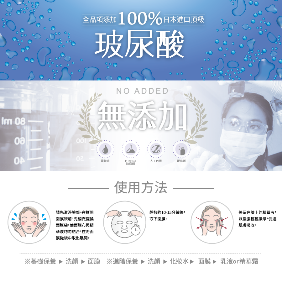 Sodium PCA:是與玻尿酸最好的組合成分;維生素B3:強化肌膚,促進蛋白質再生。